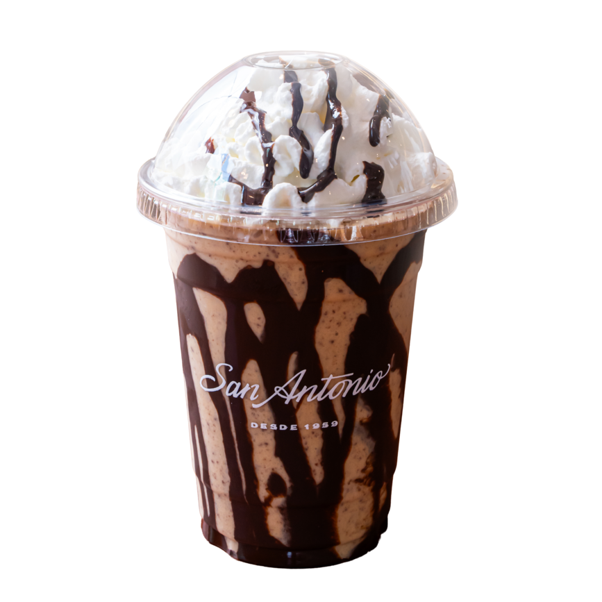 Hielo, lúcuma, crema de leche, leche fresca, brownie, fudge y crema chantilly.