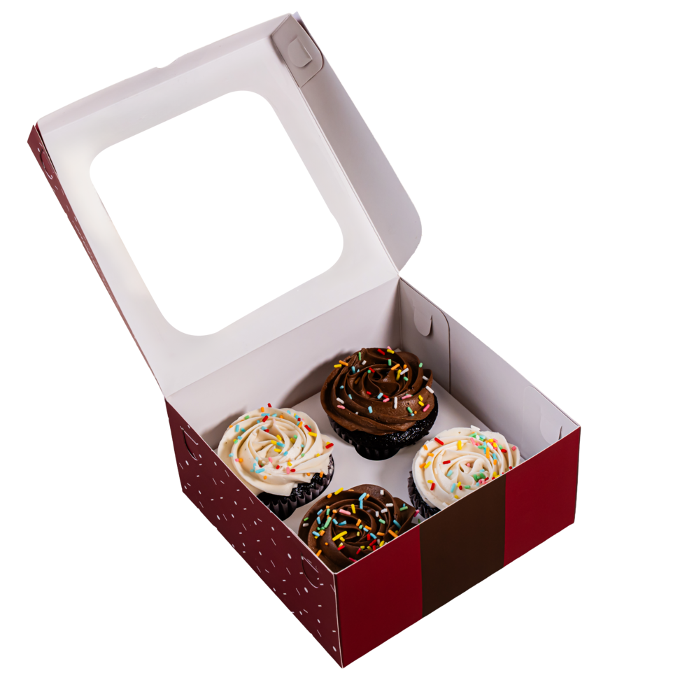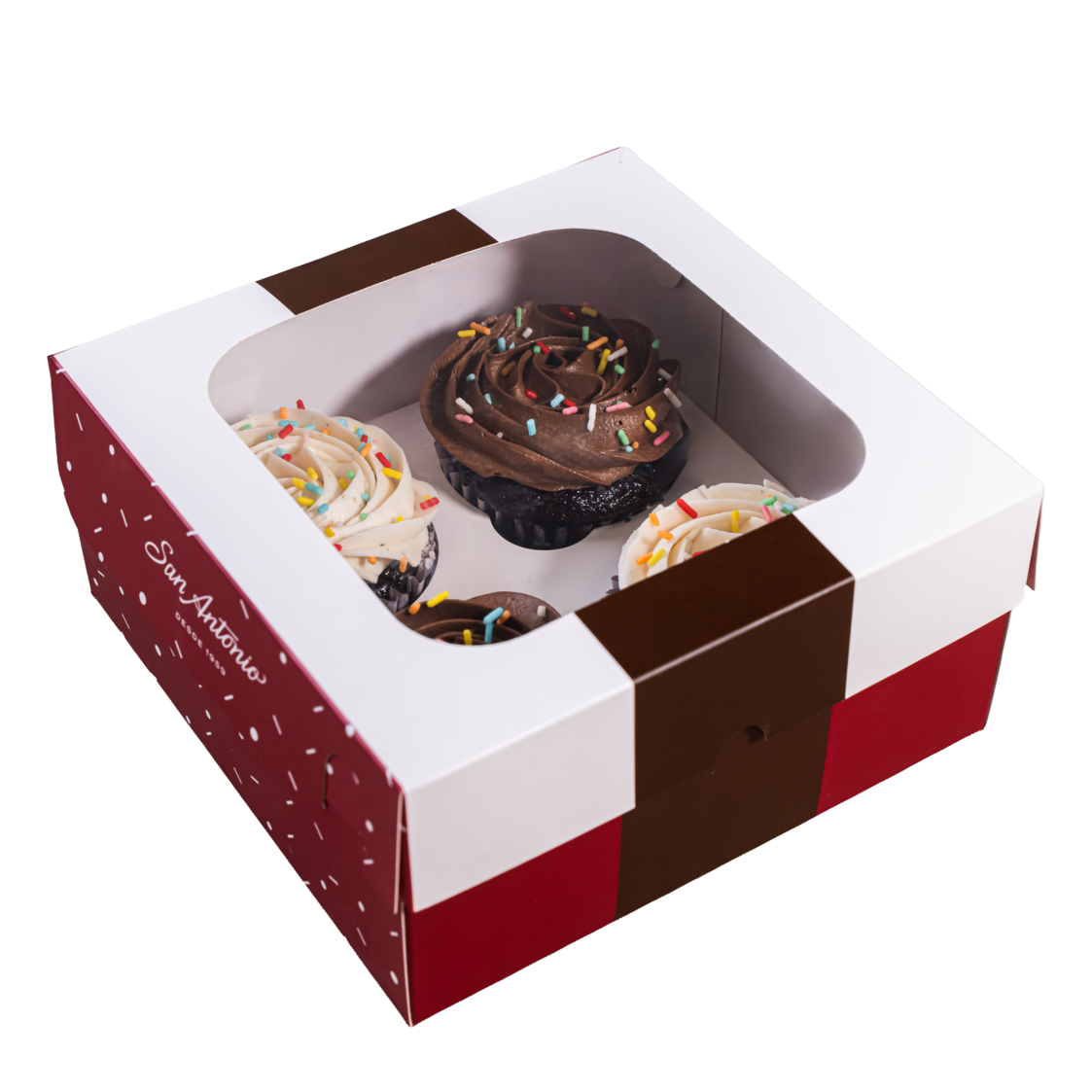 Keke de chocolate relleno con crema de avellanas con chocolate o ganache de chocolate blanco y buttercream chocolate o de vainilla y grageas de colores (Caja x 4 unidades).