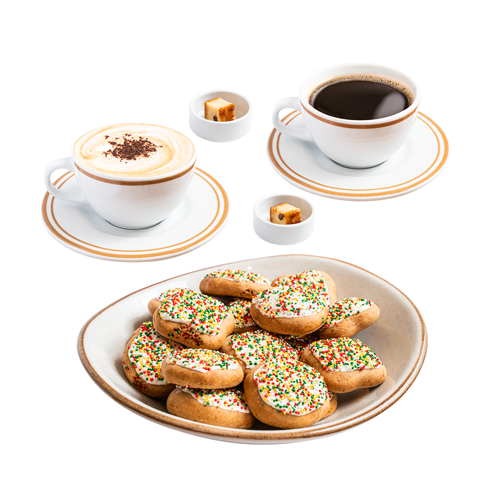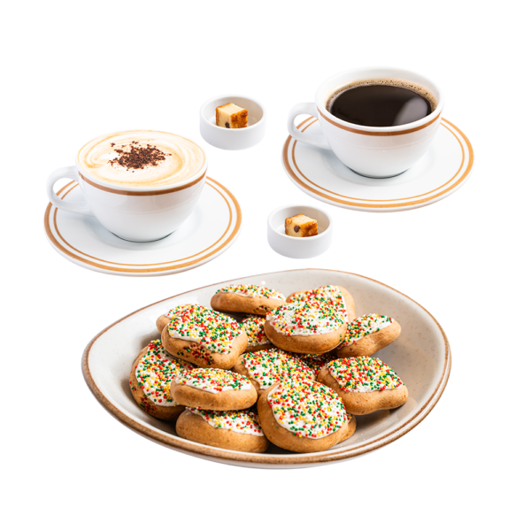 Dos Cafés (Americano, Espresso, Cortado o Capuccino) y Galletas de Miel (Alicia, Surtidas o Pfeffernusse).