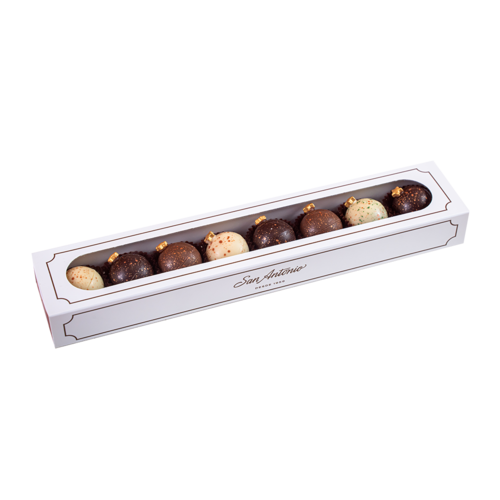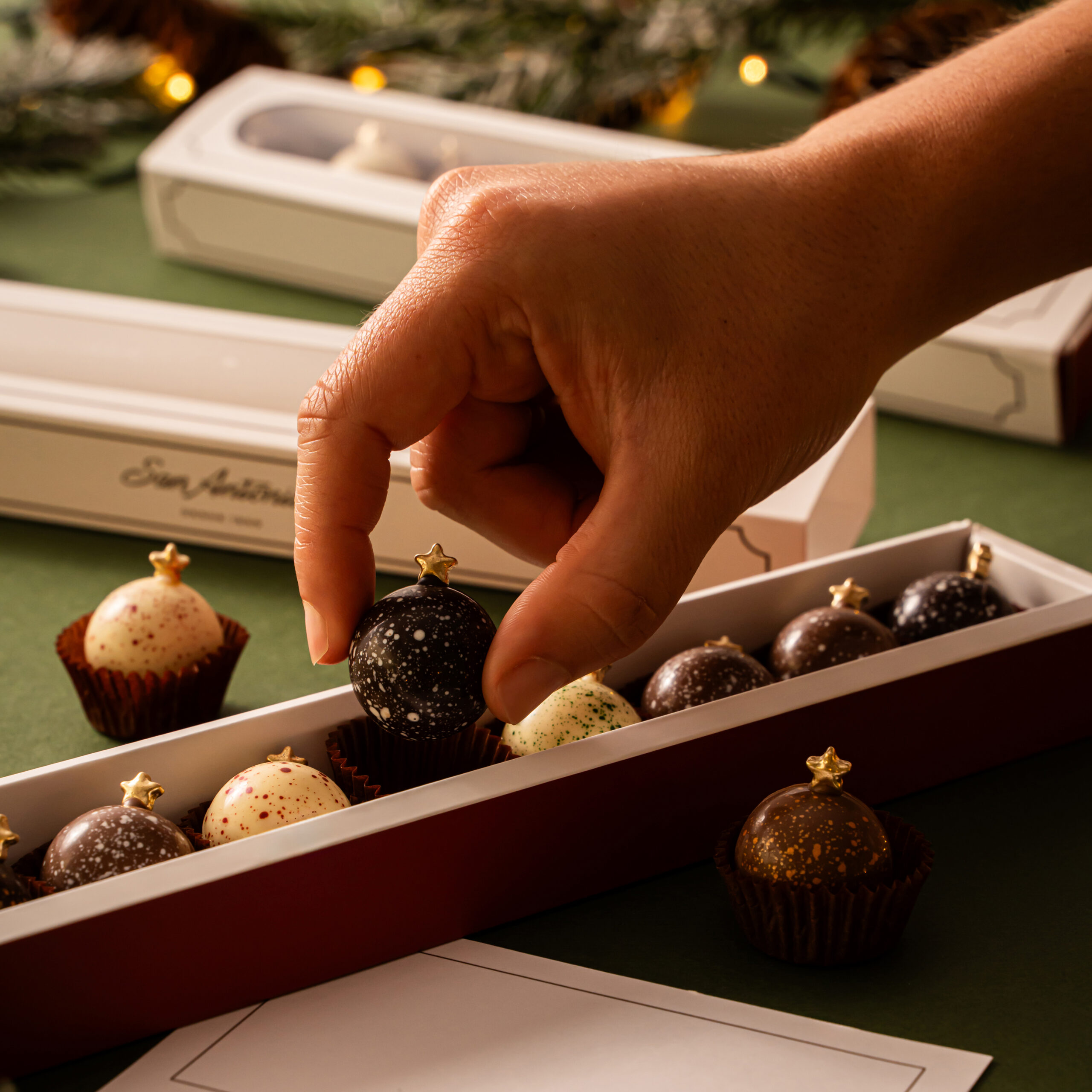 Esferas Navideñas rellenas de Crema de Avellanas o Ganache de Chocolate Blanco.