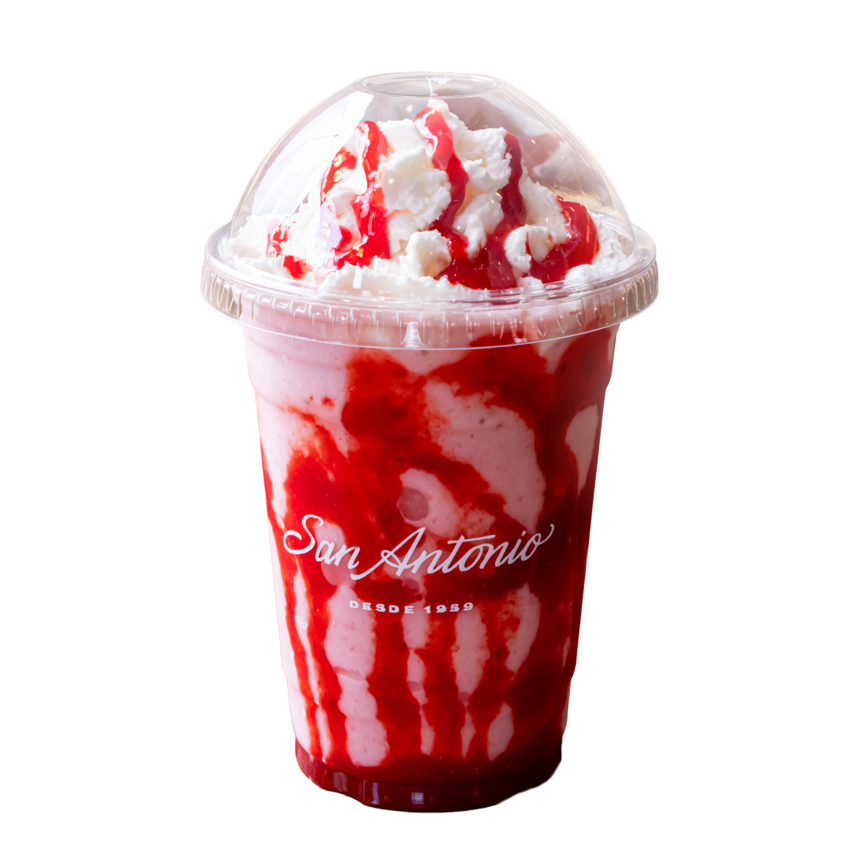 Hielo, helado de fresas, leche fresca, salsa de fresas y crema chantilly.