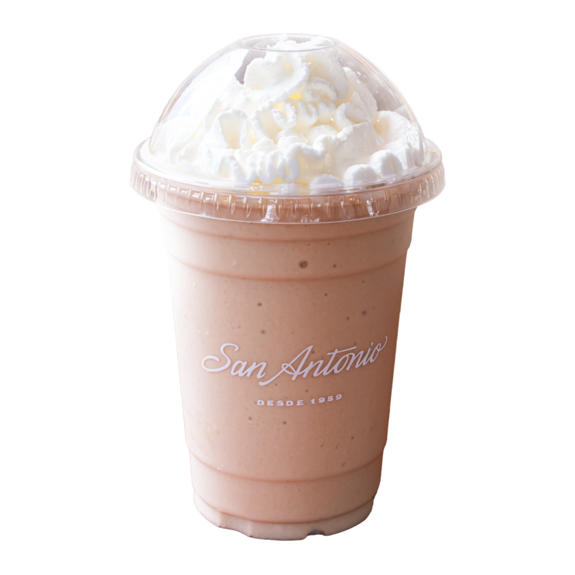 Hielo, café, ganache de chocolate blanco, galletas con chocolate, crema de leche, leche fresca y crema chantilly.