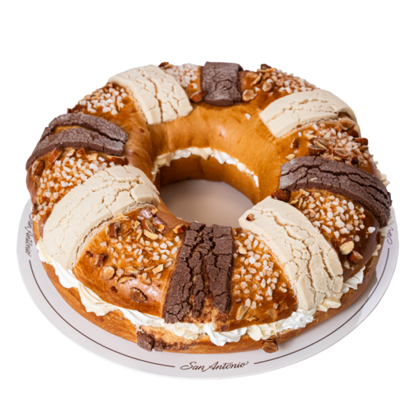 Pan de masa dulce con pasta de chocolate; almendras, azúcar perlada y cubierta de vainilla y cacao; relleno de crema chantilly y pastelera. 10 porciones