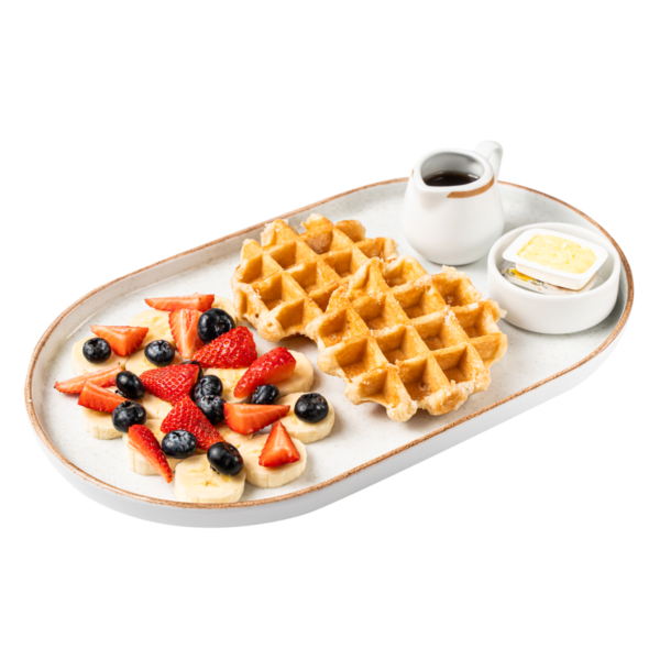 2 waffles, frutas /fresa, arándanos y plátano) y topping a elección (maple y mantequilla, fudge o manjar).