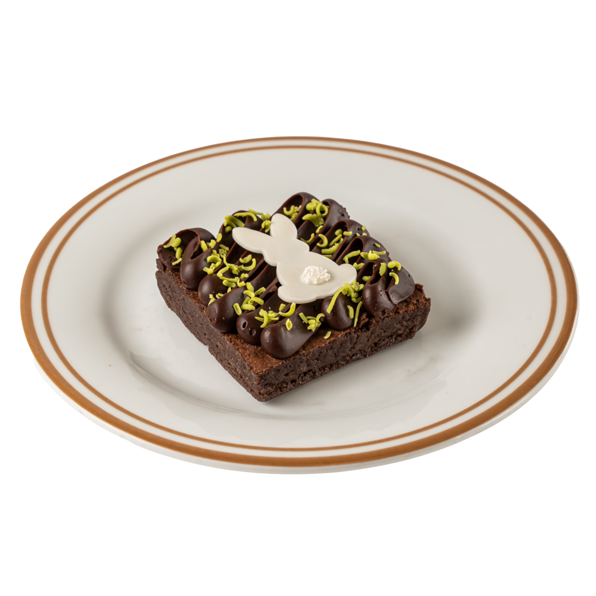 Brownie de chocolate con ganache, cobertura de chocolate blanco y zanahoria de mazapán.