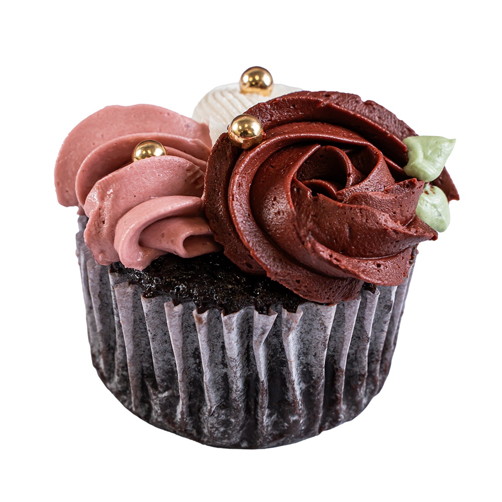 Keke de chocolate con relleno de ganche de chocolate blanco o crema de avellanas con chocolate, decorado con buttercream de vainilla y chocolate y grageas.