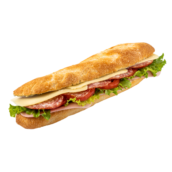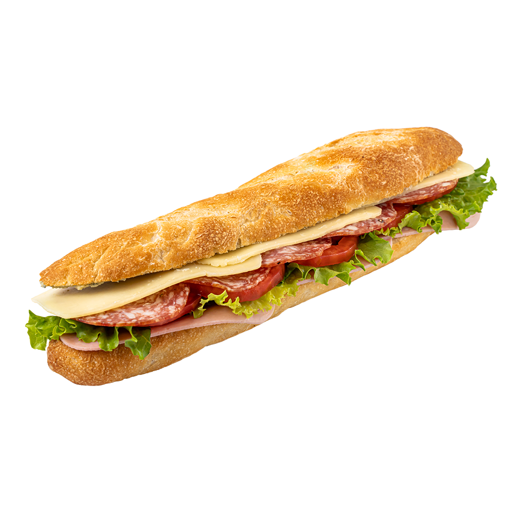 Salame, jamón inglés, quesos roquefort y gouda, lechuga crespa, tomate y mayonesa.