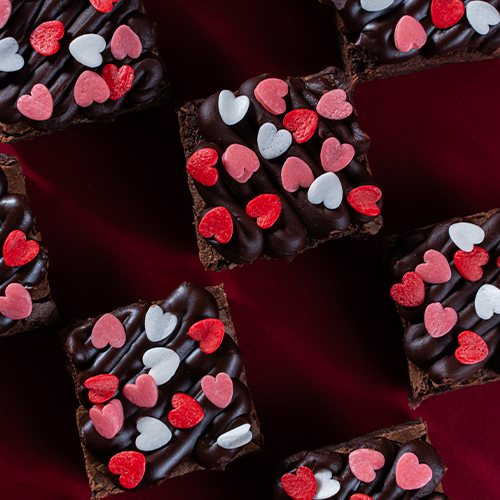 Mini Brownie con ganache y grajeas de colores en forma de corazón. Imágenes referenciales