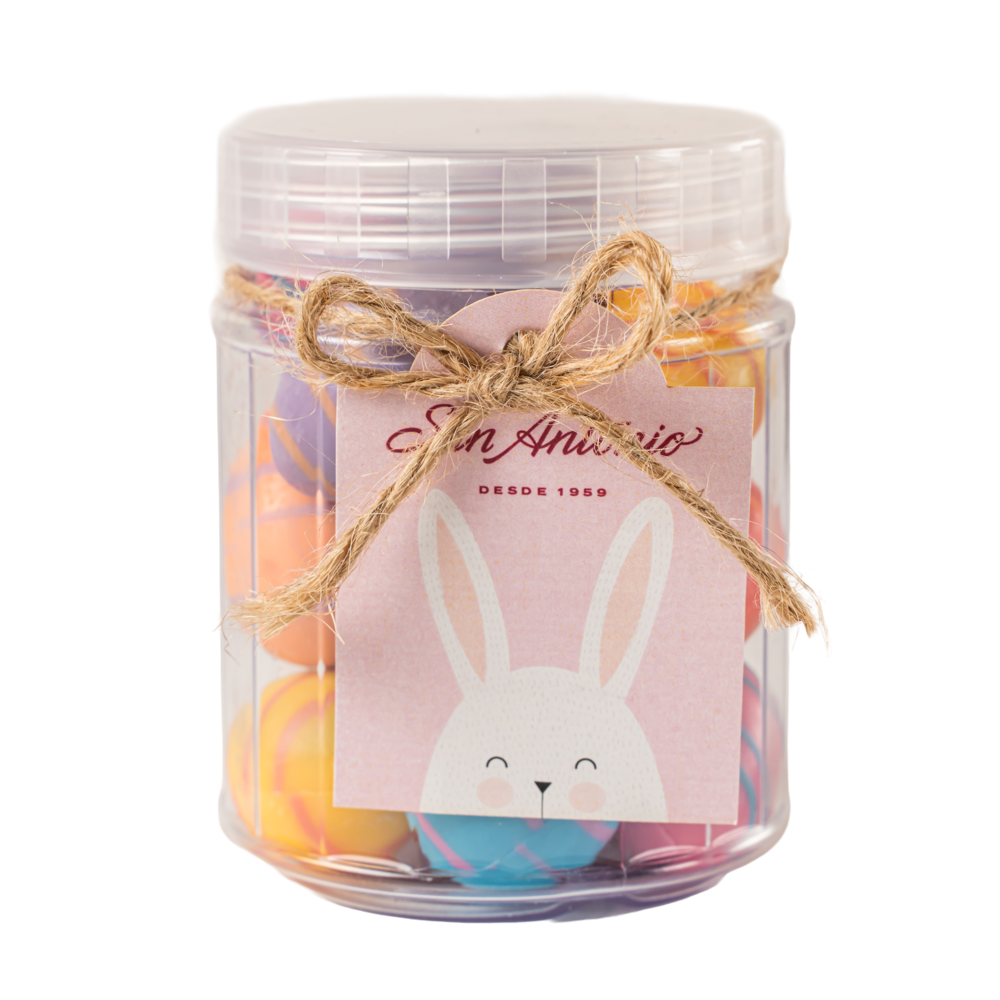 Huevitos de cobertura blanca y cobertura de leche, rellenos con crema de avellanas y ganache de chocolate blanco. Colores variados (pote).