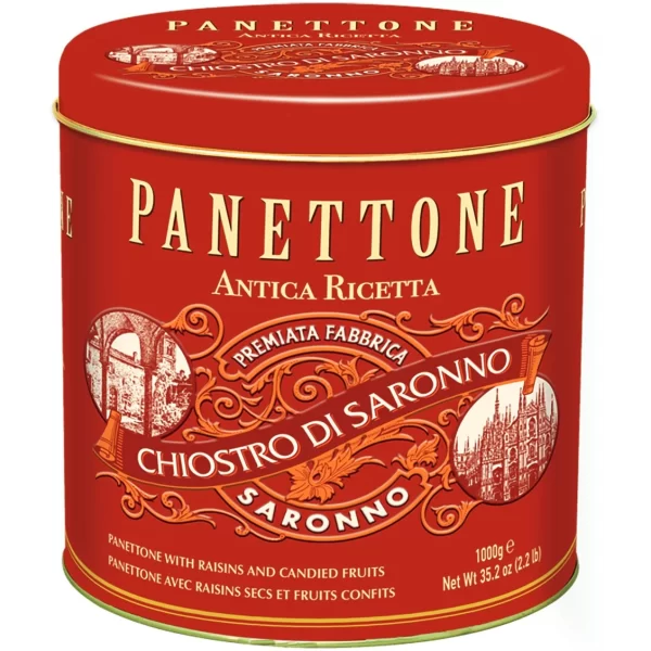 Panettone clásico en lata, con frutas confitadas y pasas (1kg).