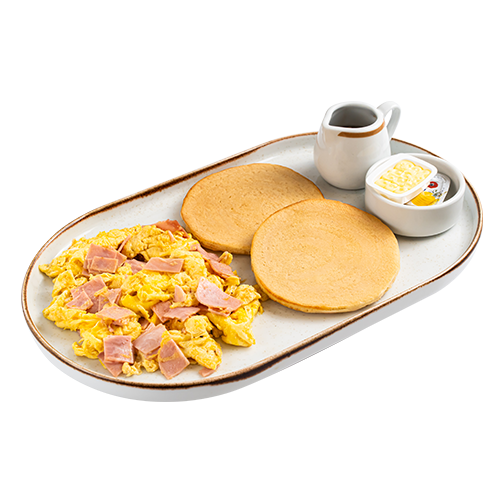 2 panqueques, huevos revueltos y jamón ingles. Incluye miel de mapple y mantequilla.