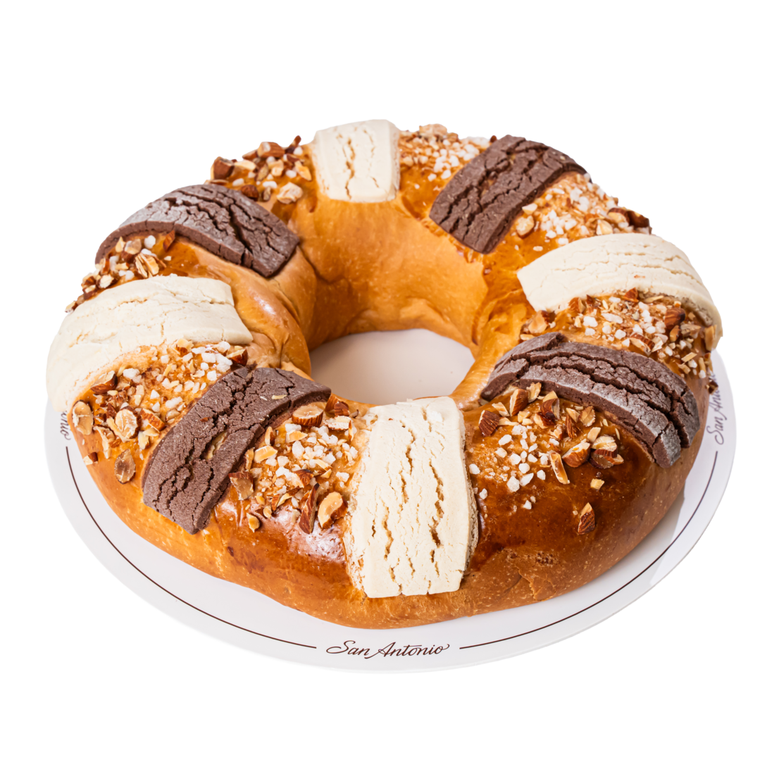 Pan de masa dulce con pasta de chocolate; almendras, azúcar perlada y cubierta de vainilla y cacao. 10 porciones