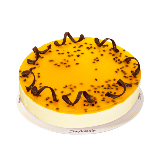 Bizcochuelo de vainilla, queso crema, crema de leche y maracuyá.