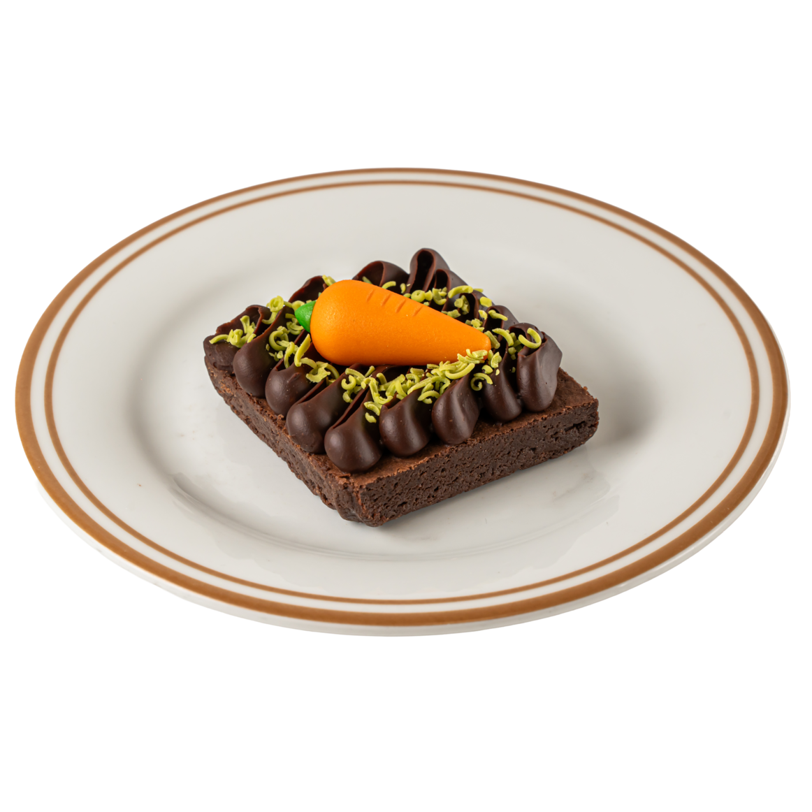 Brownie de chocolate con ganache, cobertura de chocolate blanco y zanahoria de mazapán.