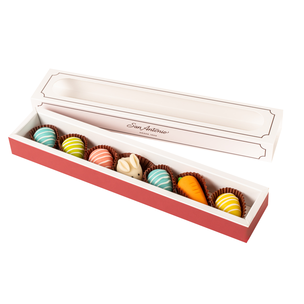 Mazapán en forma de conejo, zanahoria y huevos (caja x 7 und)