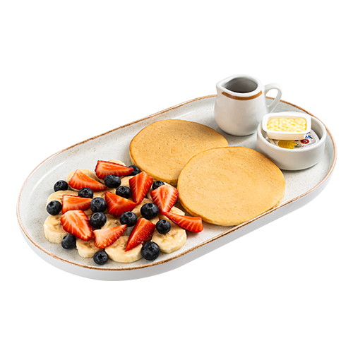 2 panqueques, frutas (fresas, arándanos y plátanos) y topping a elección (maple y mantequilla, fudge o manjar).